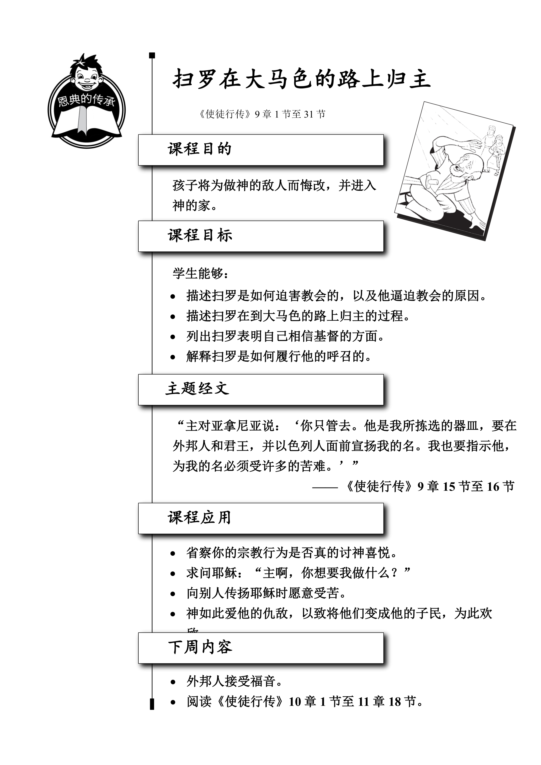 第9课:扫罗在大马色的路上归主 预备真理 “你们要将我这话存在心内,留在意中……也要这样教训你们的儿女……”——《申命记》11章18节至19节 请花时间来准备你的心思意念,按着正意分解真理的道(提后2