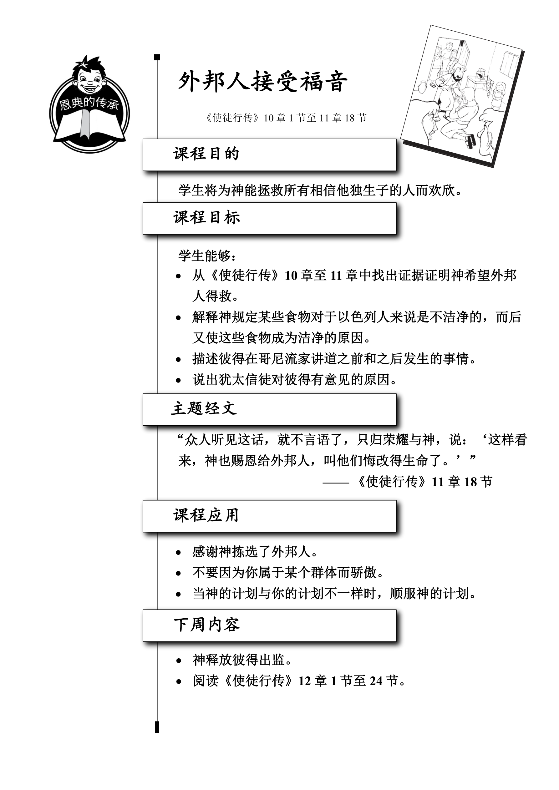 第10课:外邦人接受福音 预备真理 “你们要将我这话存在心内,留在意中……也要这样教训你们的儿女……”——《申命记》11章18节至19节 请花时间来准备你的心思意念,按着正意分解真理的道(提后2:15