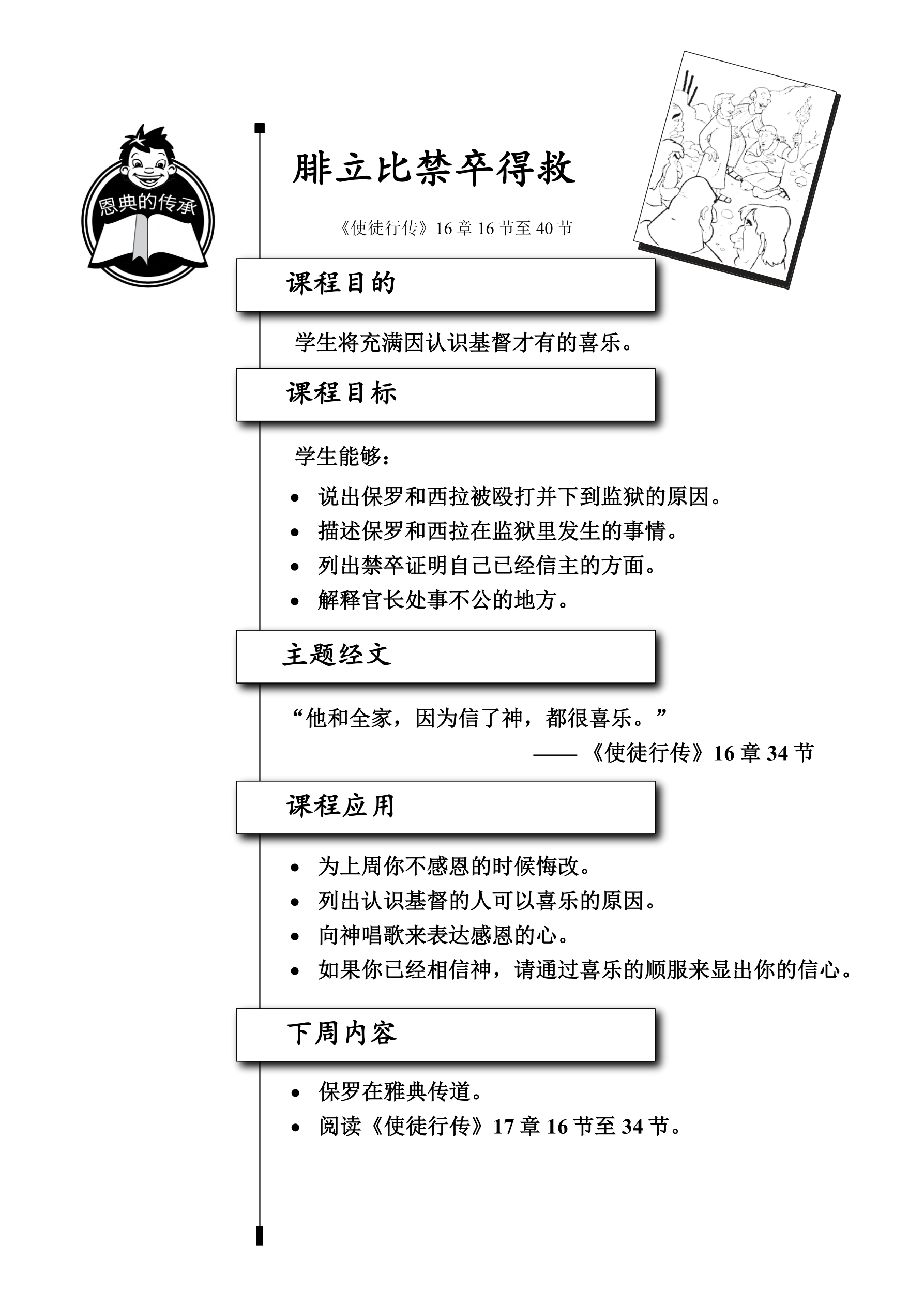 第13课:腓立比禁卒得救 预备真理 “你们要将我这话存在心内,留在意中……也要这样教训你们的儿女……”——《申命记》11章18节至19节 请花时间来准备你的心思意念,按着正意分解真理的道(提后2:15