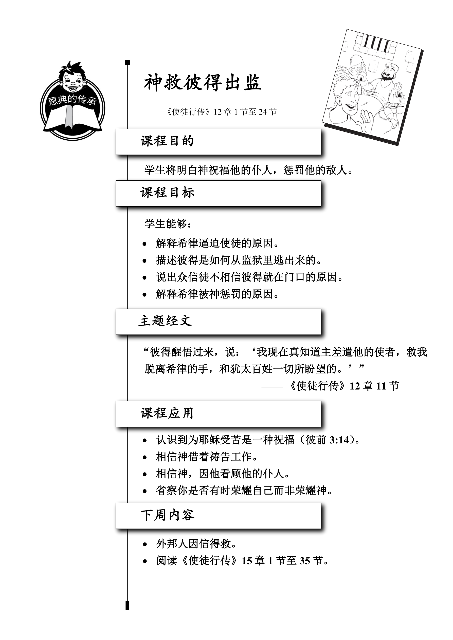 第11课:神救彼得出监 预备真理 “你们要将我这话存在心内,留在意中……也要这样教训你们的儿女……”——《申命记》11章18节至19节 请花时间来准备你的心思意念,按着正意分解真理的道(提后2:15)