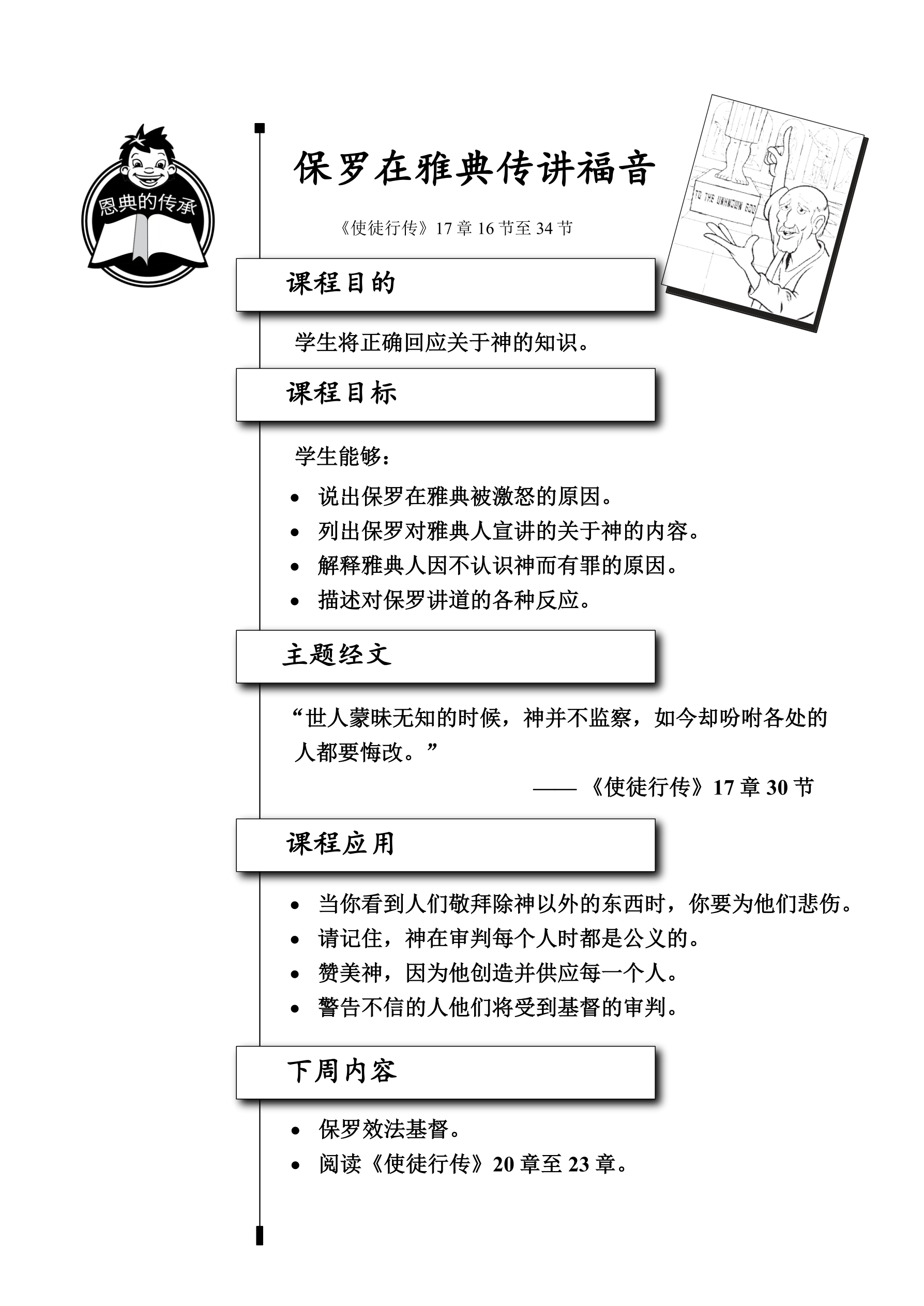 第14课:保罗在雅典传讲福音 预备真理 “你们要将我这话存在心内,留在意中……也要这样教训你们的儿女……”——《申命记》11章18节至19节 请花时间来准备你的心思意念,按着正意分解真理的道(提后2: