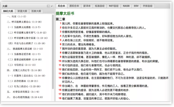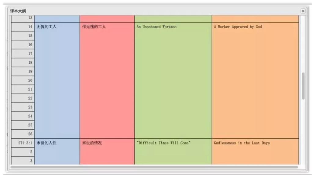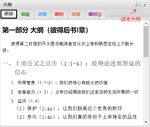 译本大纲(图标):对比不同译本分段差异,辅助释经选题。