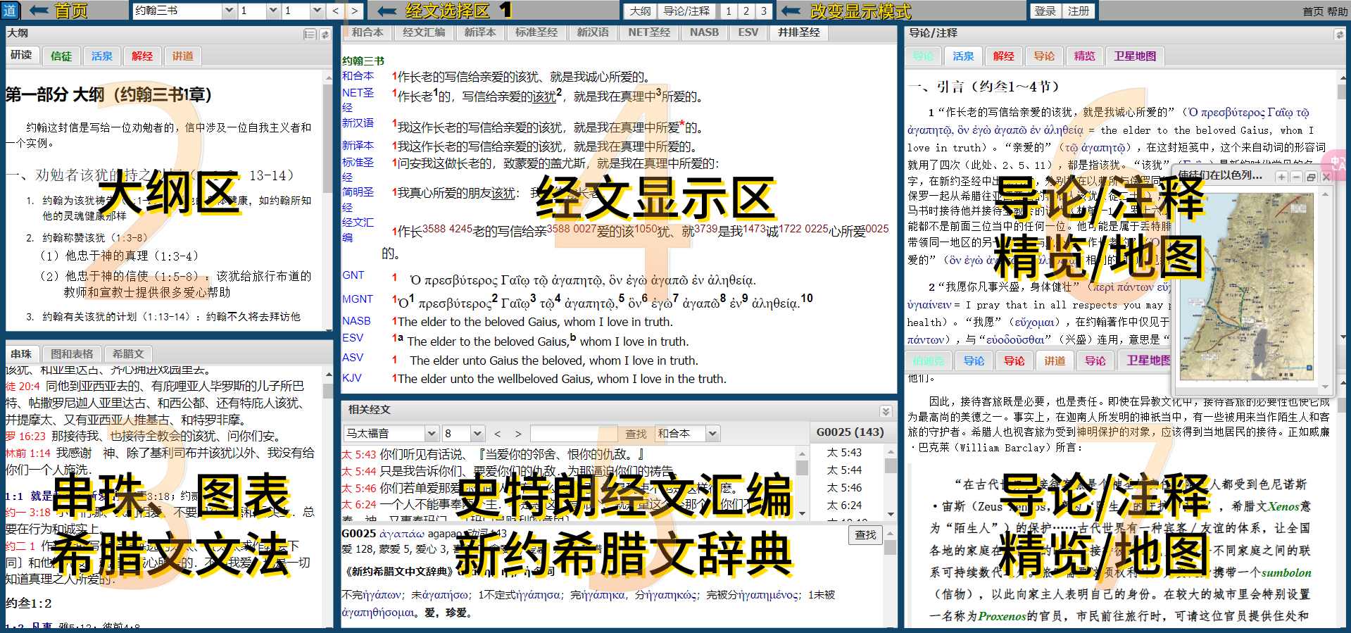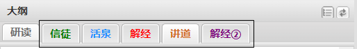大纲功能分为三类:研读大纲(灰色)、注释大纲(彩色)、和译本大纲(图标)。下面介绍它们的具体使用方法: