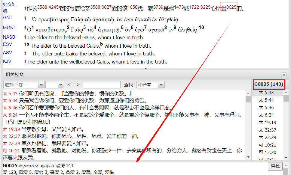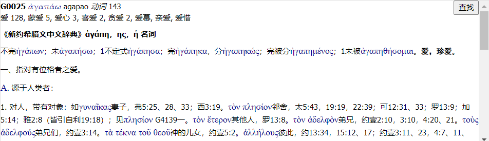 原文查找:通过史特朗编号进行深入查考。输入编号或双击经文中的编号,即可查看原文词汇的详细信息,包括词义、读音、词性及其在圣经中出现的频率和位置。例如,查考“爱”(编号0025)时, G0025 ἀγαπάω (agapao) 是一个动词,在《史特朗经文汇编》中出现143次,其翻译在新约中有多种形式:爱:128次;蒙爱:5次;爱心:3次;喜爱:2次;贪爱:2次;其他翻译:爱慕、亲爱、爱惜等。