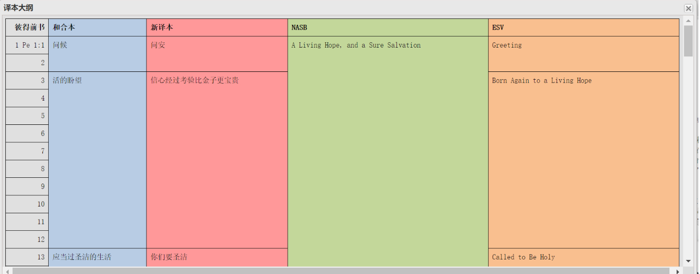 译本大纲帮助对比四个译本的分段差异:和合本、新译本、ESV和NASB。例如,在《彼得前书》1章中,和合本与新译本的分段相同,而ESV和NASB有所不同。通过对比,您可以选择适合的经文长度进行讲章选题。