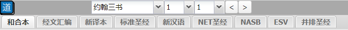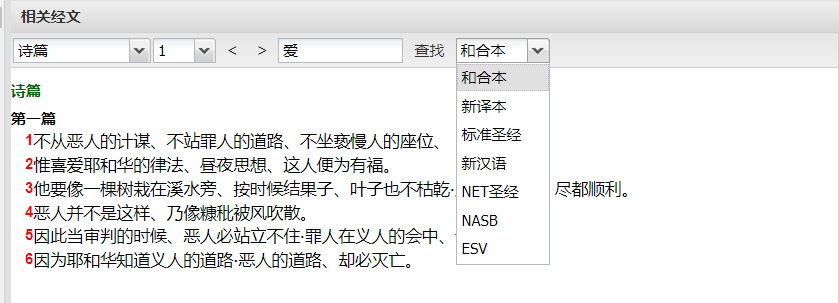 页面中部上方为经文显示区,默认显示《中文和合本》版本。您可以通过点击标题栏轻松切换其他圣经译本,系统提供以下版本: