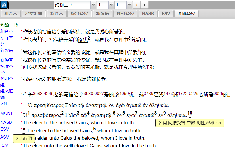 支持和合本、新译本、ESV、NASB、GNT、BHS、KJV 等多种版本。